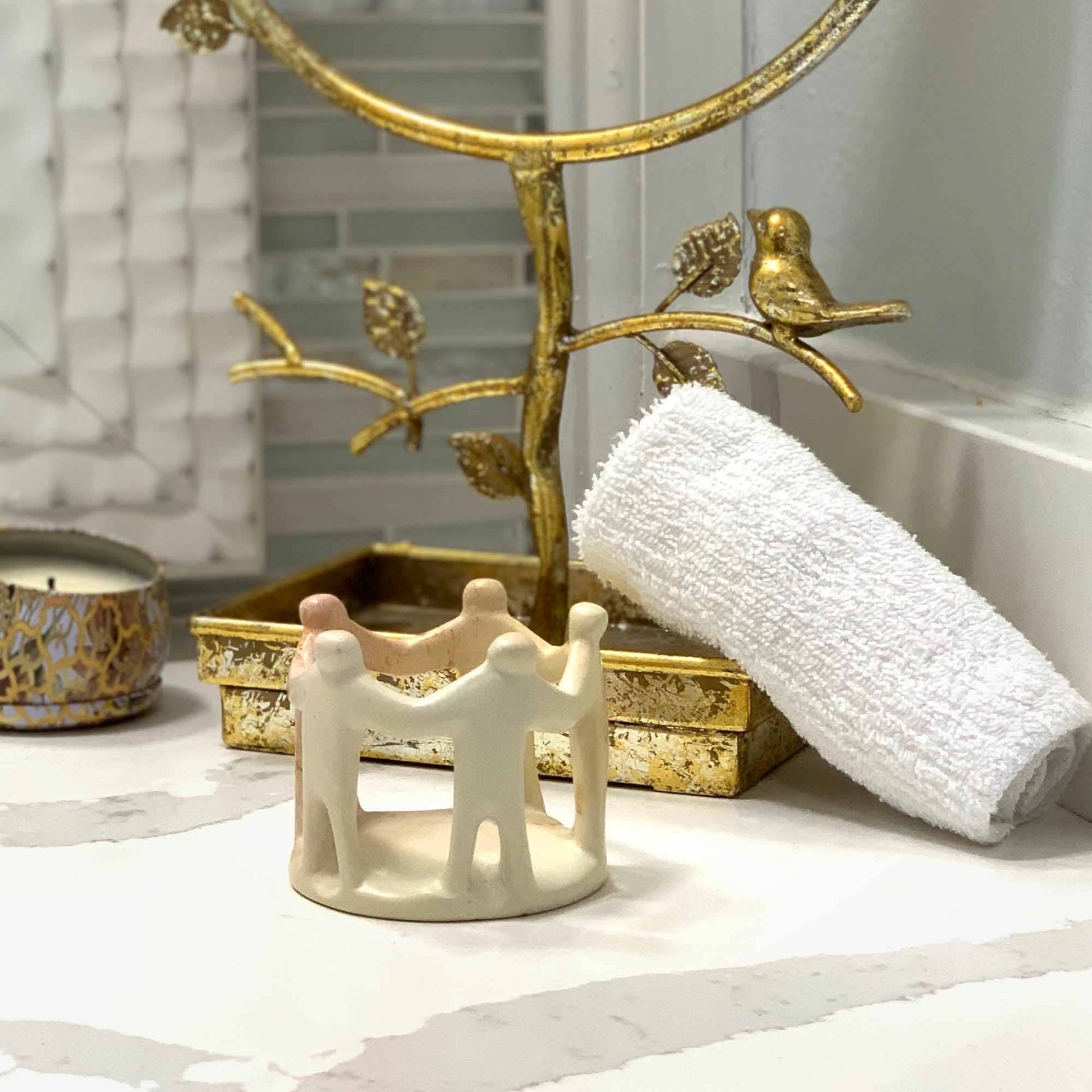 Hand carved from a single piece of Kisii soapstone by African artisans, the legend of the circle of friends has a long history. It is said that when you give the statue to a friend, it will solidify your bond with that person for the rest of your lives. The interlocked arms of the figures are meant to be symbolic of the bond shared between close friends. This also serves as a comfort gift to someone going through a difficult time, or suffering from a loss. It is a reminder that those around you offer support. Product features: Measures approximately 3 inches tall by 3 to 3.5 inches in diameter. Due to the hand-carved nature, each piece may vary slightly in size. A natural stone, color variations will range from cream to pink to gold to gray in any single piece.Each piece has gone through multiple stages of sanding and waxing, giving the soapstone a satiny finish.