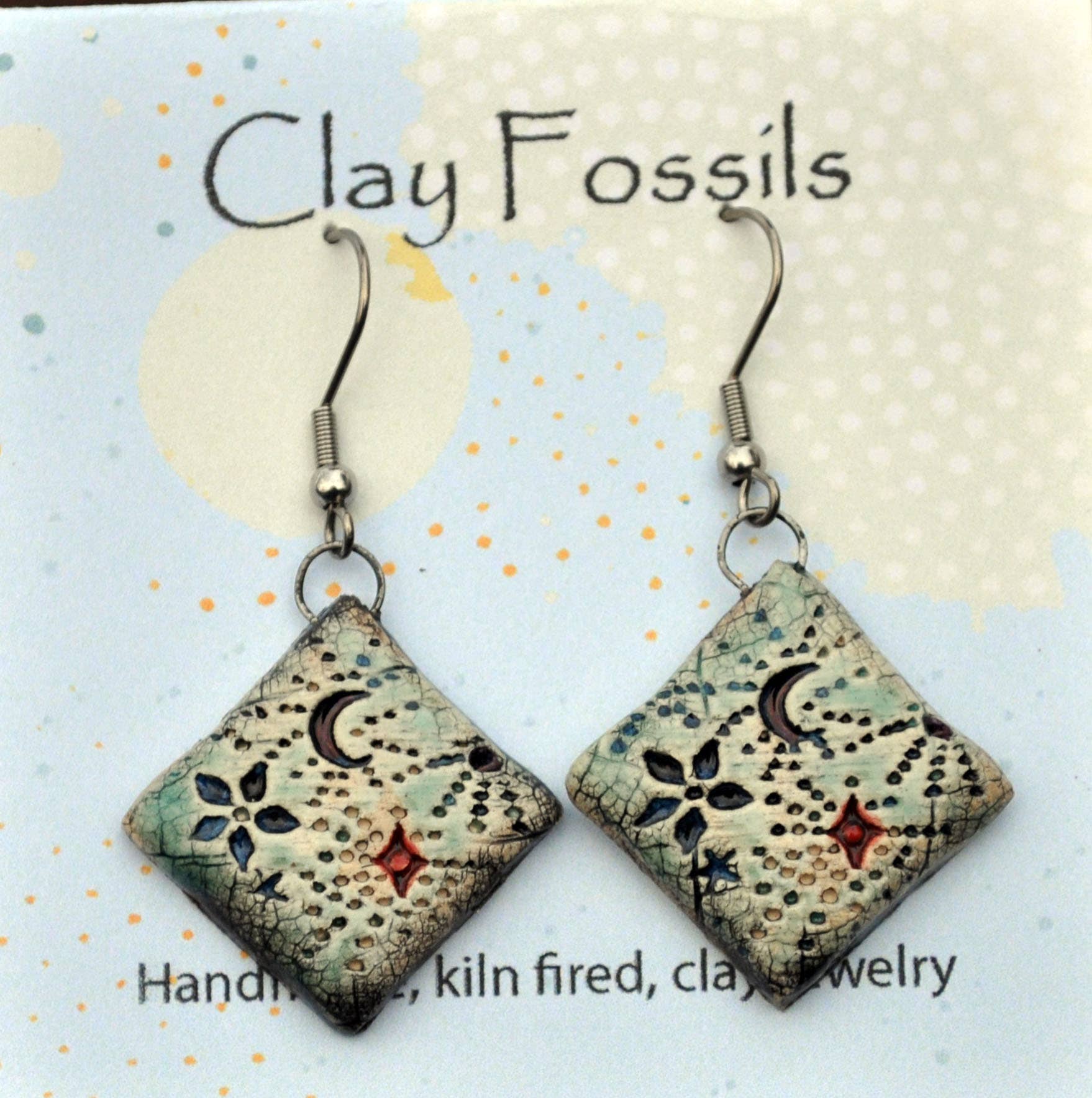 Handmade, ceramic clay earrings that incorporate imagery from Susan’s original drawings. These pieces are fired twice in a ceramic kiln. Part of the beauty of handmade is that you will see variations from piece to piece with no exact duplicates. Many steps go into the making and firing process that give these highly detailed pieces their unique and delicate look. Casual enough for blue jeans or great for an evening out. Non- tarnishing, hypoallergenic stainless ear-wires. Lightweight but durable. These earrings come on a card with a short description on the reverse side.