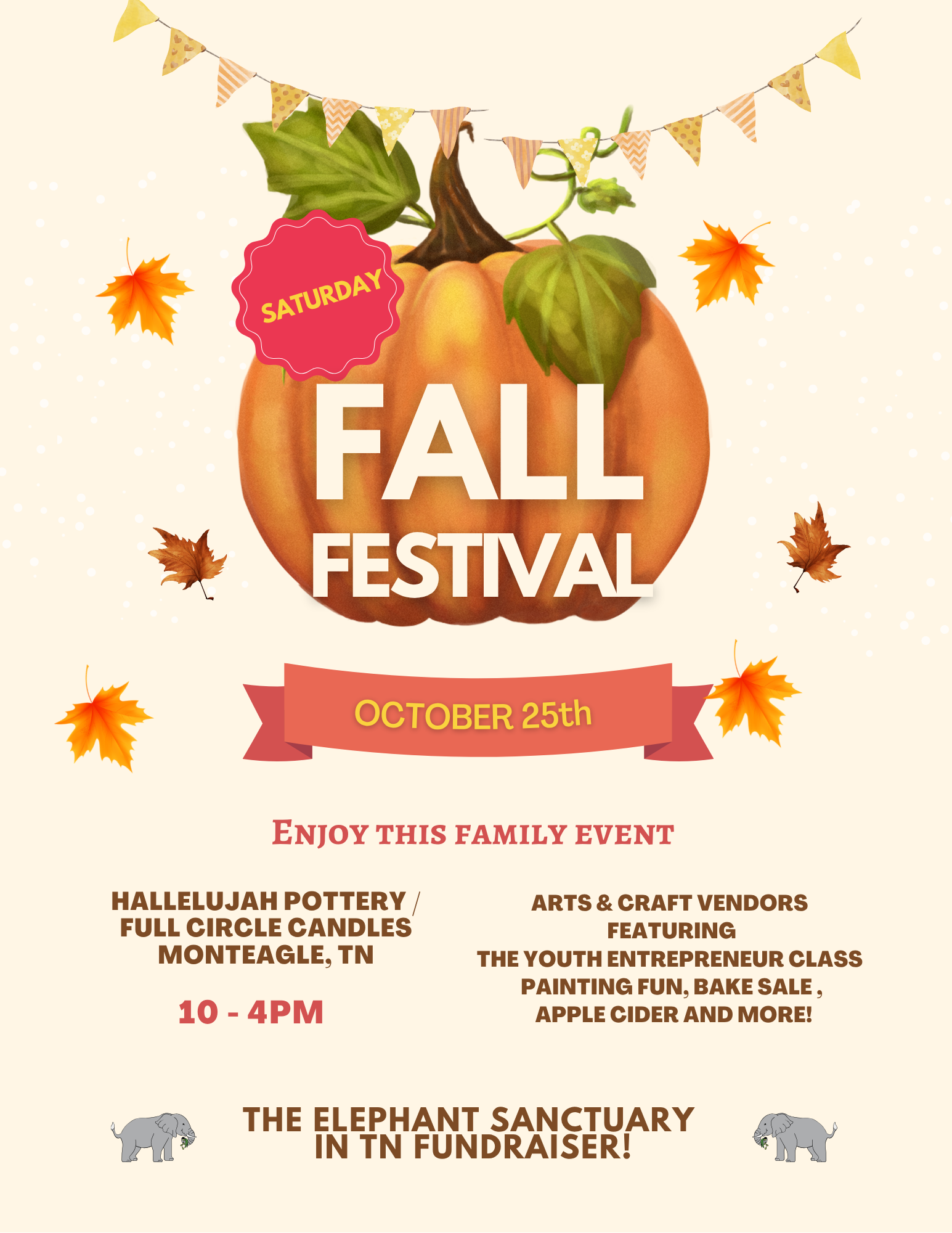 Come out to our annual Fall Festival benefiting The Elephant Sanctuary in TN. The Youth Entrepreneur Class will be selling their handmade goods, donating a portion to the cause, along with other art and craft vendors. We will also have a fun cookie decorating table, apple cider, and more.